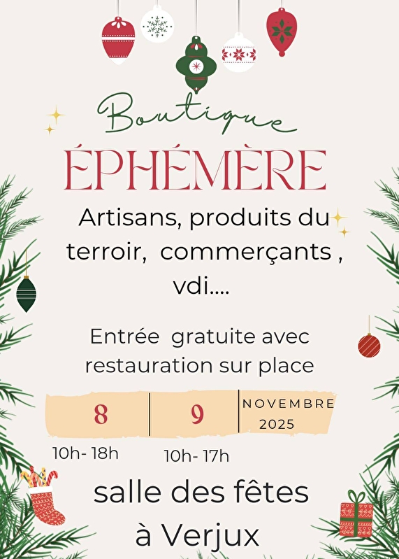 La boutique éphémère aura lieu le 8 novembre de 10h à 18h et le 9 novembre 2025 de 10h à 17h ! Entrée gratuite à la boutique éphémère où se trouve des artisans, des produits du terroir, des commerçants, vdi... Restauration sur place !