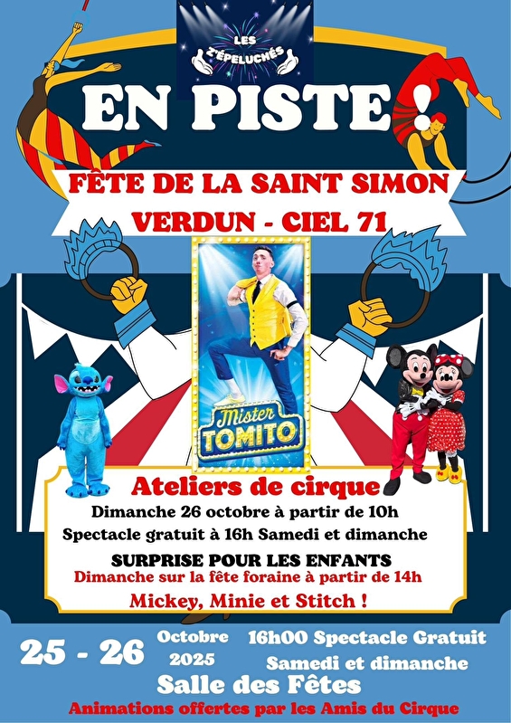 La fête de la Saint-Simon aura lieu le 25 et 26 Octobre 2025 ! Fêtes foraine toute la semaine. Un spectacle gratuit aura lieu à 16h le samedi et le dimanche. Surprise pour les enfants dimanche sur la fête foraine à partir de 14h.
