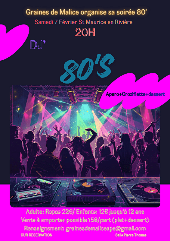 Graines de Malice organise sa soirée 80s le samedi 7 février à 20h ! Au menu : apéro, croziflette et dessert. Le repas est à 22€ pour les adultes et à 12€ pour les enfants. Vente à emporter possible : 15€ la part (plat+dessert)