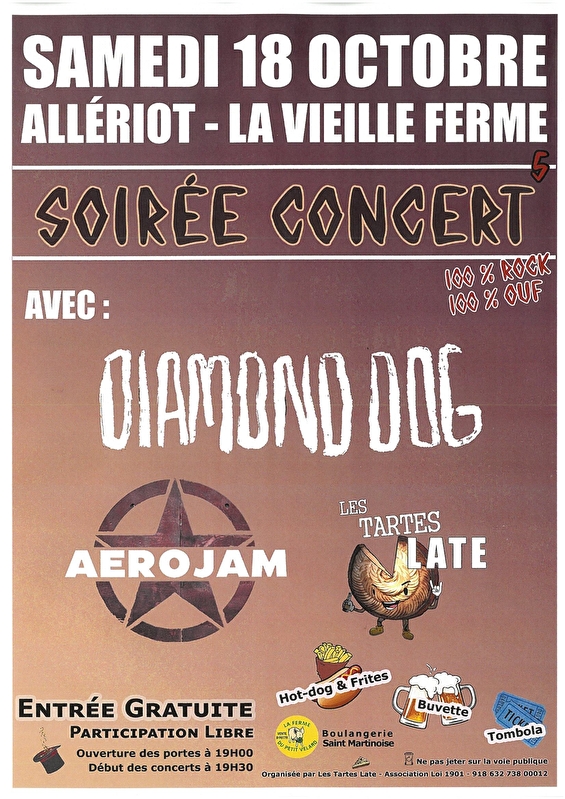 Soirée concert 100% rock à la Vieille Ferme ! L'association Les Tartes Late convie les groupes Diamond Dog et Aerojam.