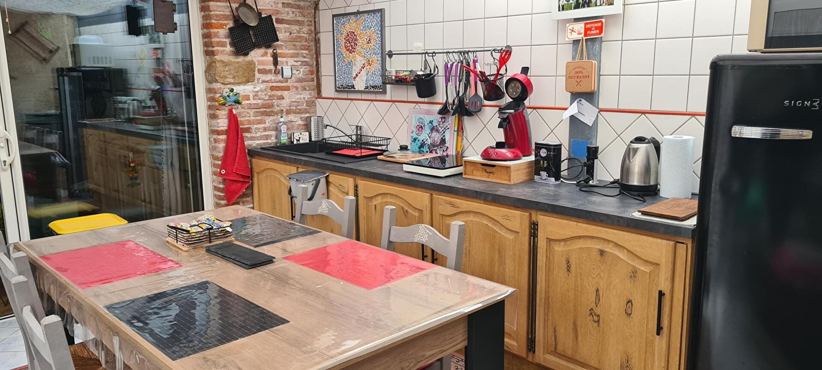 Composition : Chambre totalement indépendante (accès) au rdc d’une aile de la maison. Wifi (fibre). Chauffage PAC. Climatisation. TV dans la chambre. Chambre (lit 2 p. 160x200cm) avec salle d’eau privative (douche/Wc) + pièce de vie privative attenante accessible par extérieur (espace repas & détente + cuisine complète avec micro-ondes, four, réfrigérateur et plaques électriques). Terrasse + jardinet clos + parking privés. Local vélos. Toutes commodités dont restaurants 6.5 km. Supermarché 5.5 km.