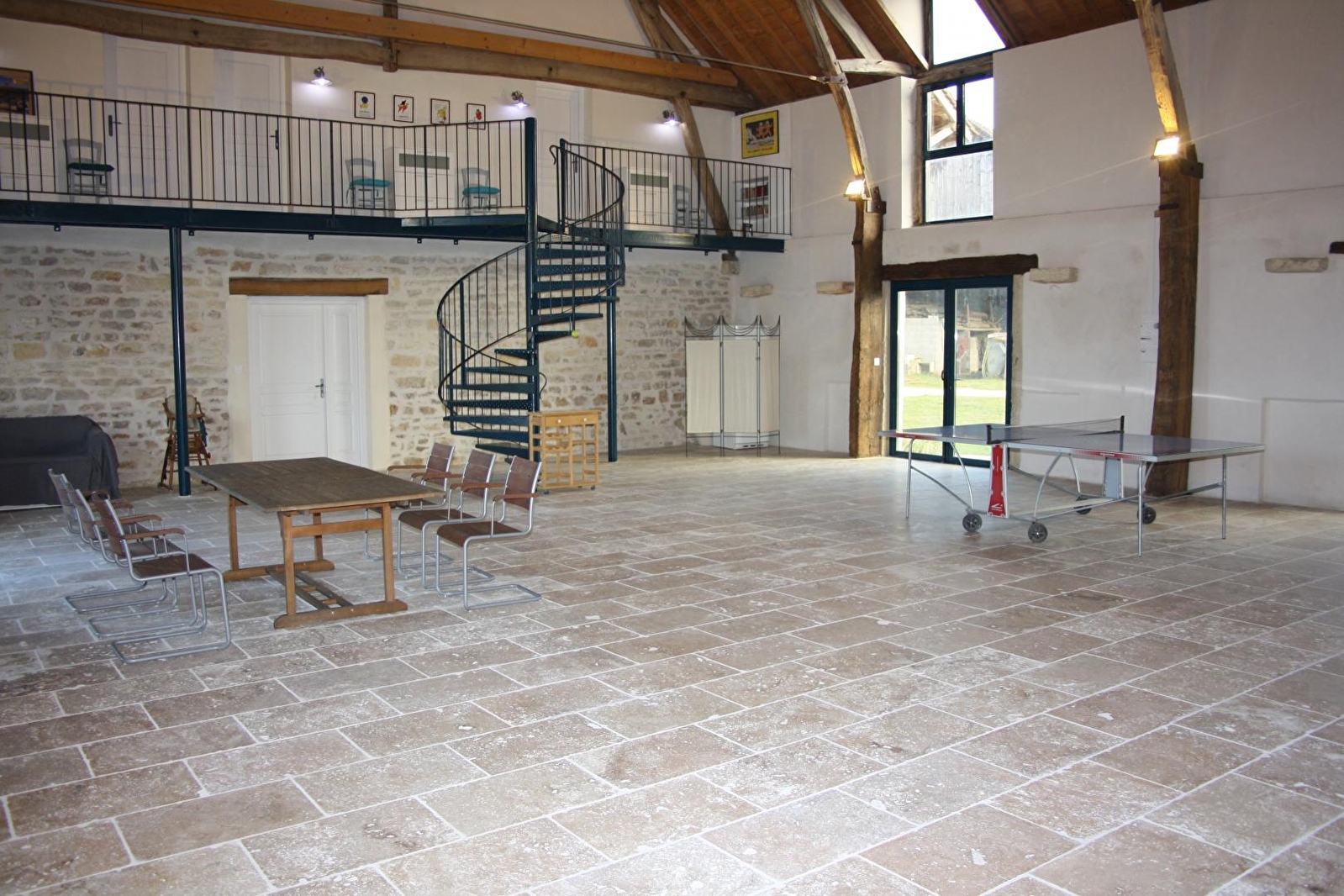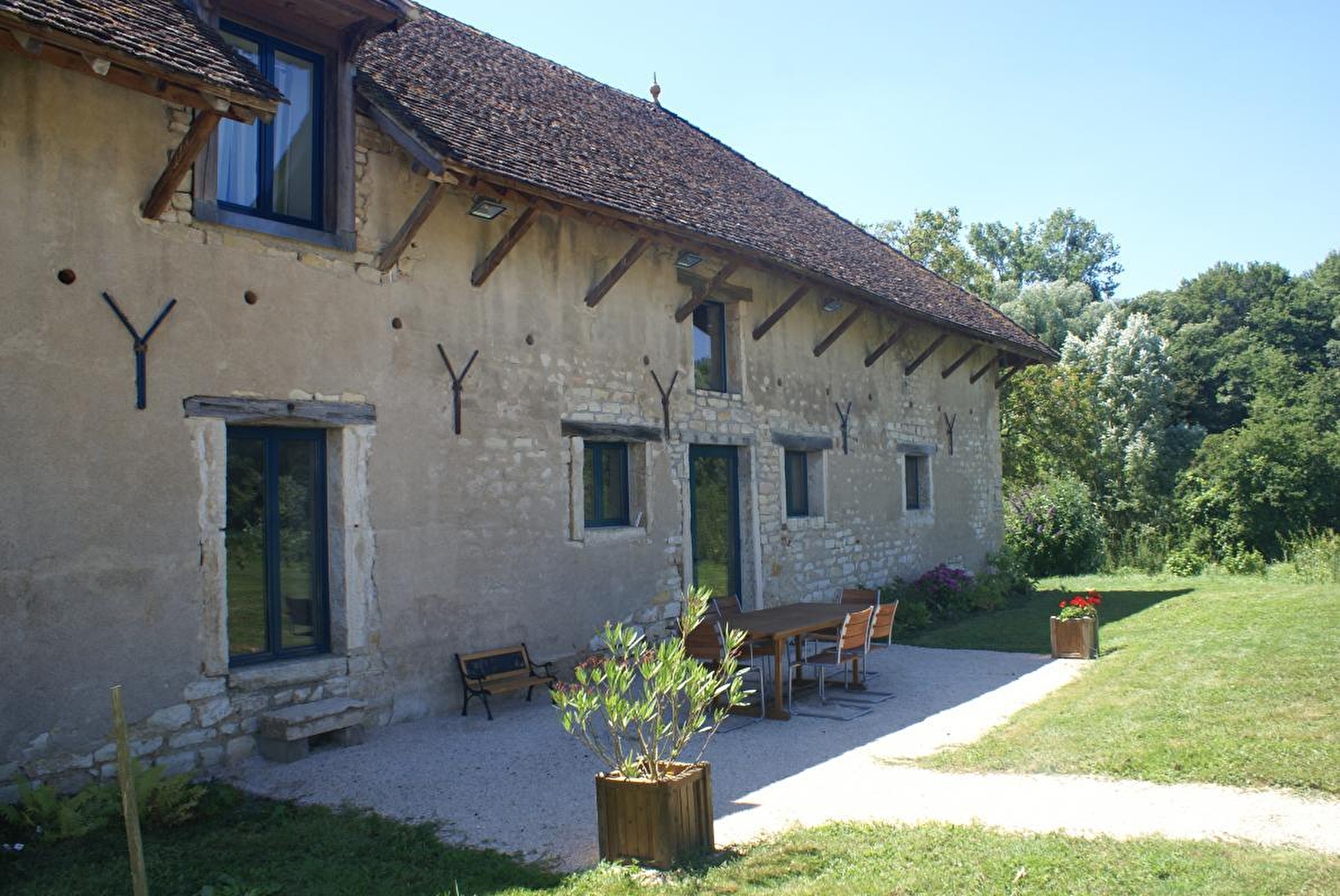 Pascale & André vous ouvrent les portes d'une ravissante authentique grange de caractère du XVIIIe, soigneusement restaurée dans les règles de l'art, jouxtant l'élégante demeure de maître du XVIe qu'ils occupent au creux d'une propriété de 16 ha pétrie d'histoire (en large partie "naturelle"), ancien "moulin d'étang" adossé à un plan d'eau de pêche privé de 6ha (carpes, brochets, sandres etc…). Calme & tranquillité, blotti en pleine campagne péri-urbaine chalonnaise, en lisière de champs, à l'orée d'une vaste forêt sauvage. Littéral havre de paix & repos, véritable "mini paradis vert". Le privilège de pouvoir observer la faune sauvage sur place (sangliers, renards, chevreuils…). Gîte de grand confort. Chaleureux cachet campagnard aux accents contemporains mixant traditions & modernité dans l'esprit d'une douce "maison de famille", sublimé par les riches traces du bâti d'origine (poutres & charpente) dont une exceptionnelle pièce "cathédrale" (150m² sous 10m de hauteur), aujourd'hui salle de jeux & loisirs (trampoline, ping-pong, baby-foot, fléchettes…). Beaucoup de charme & caractère. Cosy & ultra douillet. Équipement très complet. Intimiste large terrasse en gravier ouverte sur un agréable spacieux jardin privé (avec panier de basket) & la campagne environnante, jouxtant un vaste verger fruitier (pommiers, cerisiers, poiriers… / cueillette possible). Accès à la piscine chauffée de la propriété (10x5m).