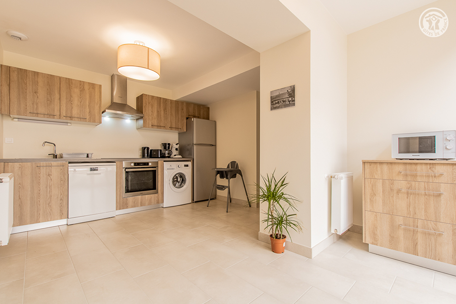 Composition : Maison individuelle. Wifi. Chauffage central gaz. Rdc : cuisine, séjour, salon, chambre PMR (lit 2 p. 160x200cm), salle d'eau PMR (douche), Wc indépendant PMR. 1er étage : 4 chambres (lit 2 p. 160x200cm / lit 2 p. 160x200cm / 2 lits 1 p. 90x200cm / 4 lits 1 p. 90x200cm dont 2 superposés), 2 salles d'eau (douches), Wc indépendants. Terrain + double terrasse (une en partie abritée) + parking privés. Supermarché 6 km. Commodités 9 km.