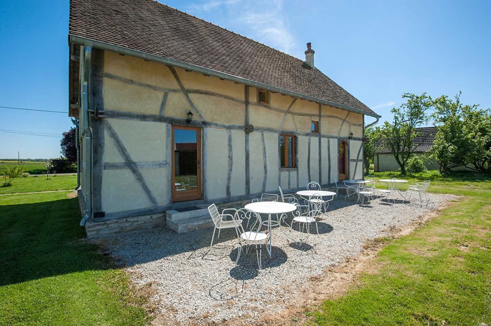 Très élégante demeure contemporaine aménagée dans le strict respect des codes architecturaux traditionnels du pays (construite et aménagée en briques & pans de bois avec torchis, telle une authentique ferme bressane d'époque) sise sur un ancien petit domaine agricole familial intégralement revisité en confortable villégiature (propriété comprenant 3 gîtes). Calme & tranquillité totales au cœur d'un paisible petit hameau rural résidentiel de la douce campagne chalonnaise, lové en lisière immédiate de champs & prairies, à deux pas d'un bucolique étang & de la vaste forêt domaniale de Gergy, immense « poumon vert » du territoire à parcourir lors d'apaisantes promenades à pied comme en VTT. Agréable environnement champêtre & naturel préservé, à 3 km du bourg typique d'Allerey-sur-Saône, chargé de grande histoire de par sa rente de situation (situé tout à la fois sur les rives de la Saône & l'ancienne voie romaine Agrippa), tour à tour port fluvial majeur du pays Beaunois & de ses vins jusqu'au XVIIème siècle, important nœud ferroviaire de voyageurs & marchandises (19ème/début 20éme) puis l'un des 20 rares « camp-hôpital américain » durant la 1ère guerre mondiale. Spacieux gîte de bon confort. Chaleureux cachet campagnard de style & caractère. Large terrasse privative ouverte sur un agréable jardin en commun engazonné & arboré, espace réservé aux deux gîtes niché sur une vaste propriété soignée & fleurie disposant d'un verger fruitier (cerisiers, pruniers, pêchers, pommiers, poiriers… / cueillette possible).