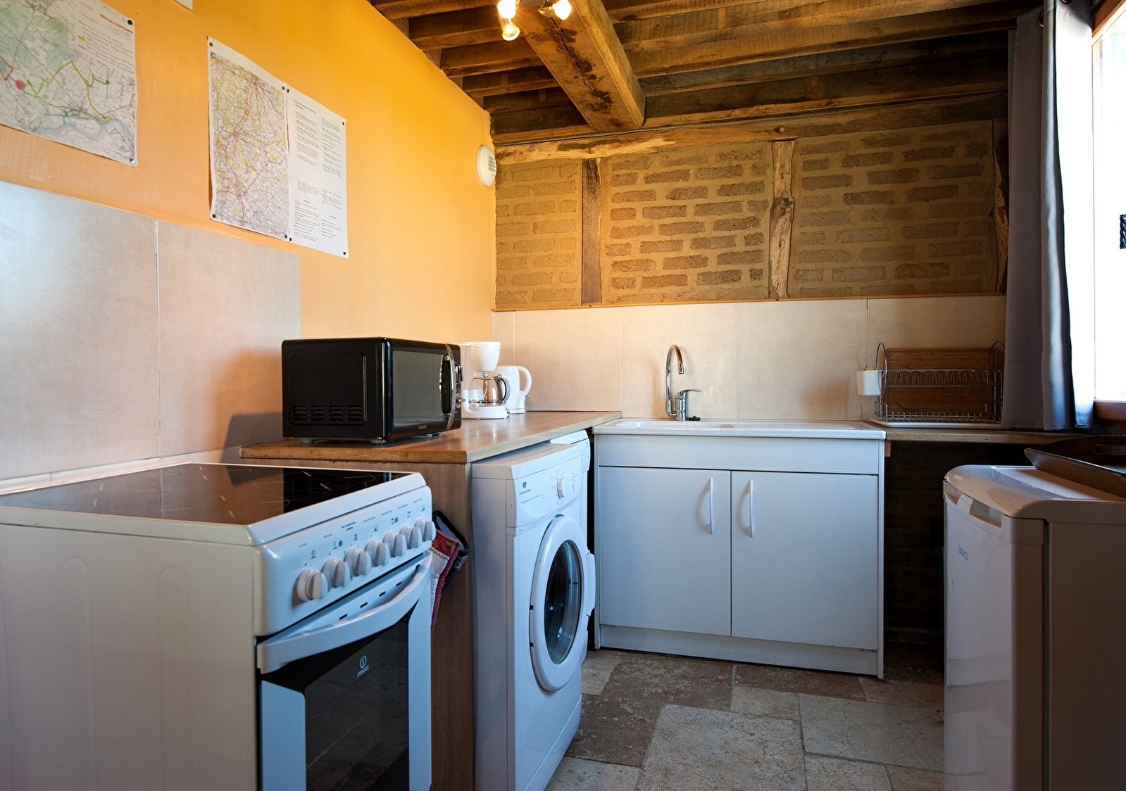 Composition : Maison comprenant 2 gîtes (indépendance totale) jouxtant l'habitation des propriétaires et 1 autre gîte (bâtiment bien séparé et espacé). Wifi. Cheminée + chauffage électrique. Rdc : séjour-cuisine-salon, Wc indépendant. 1er étage : 2 chambres (lit 2 p. 140x190cm + lit 1 p. 90x190cm / 2 lits 1 p. 90x190cm), salle d'eau (douche), Wc indépendant. Terrasse + parking privés. Jardin commun aux 2 gîtes. Local vélos + grand terrain en commun. Supermarché 7 km.