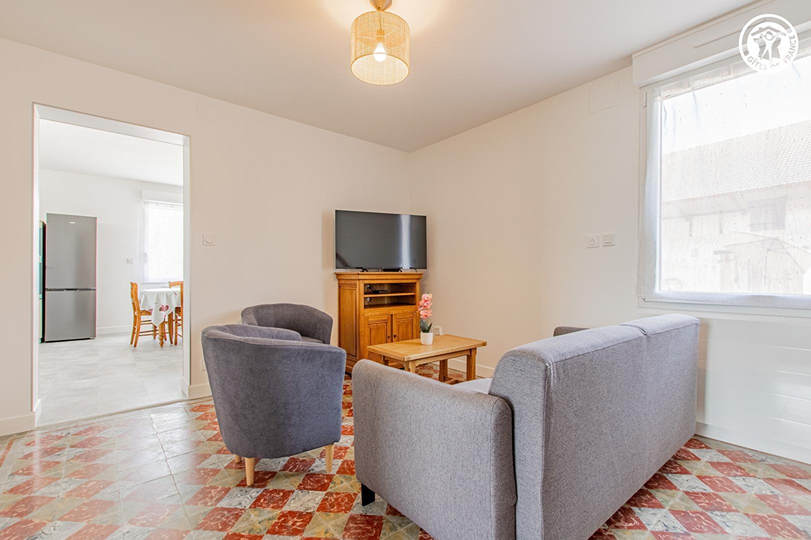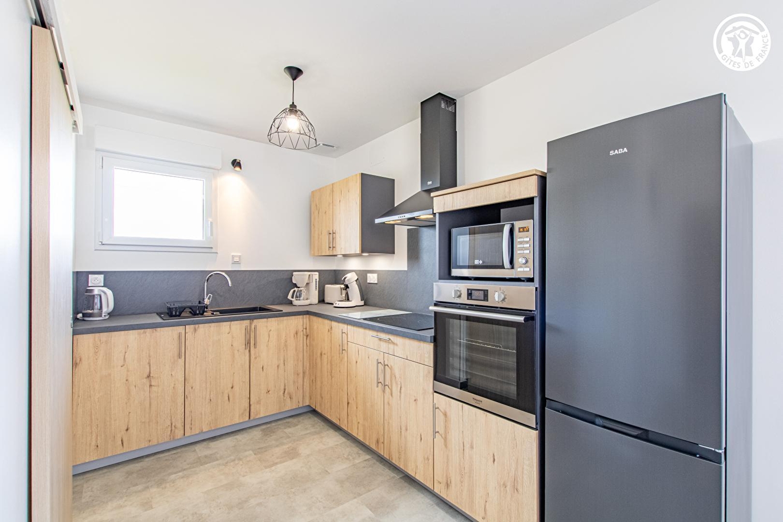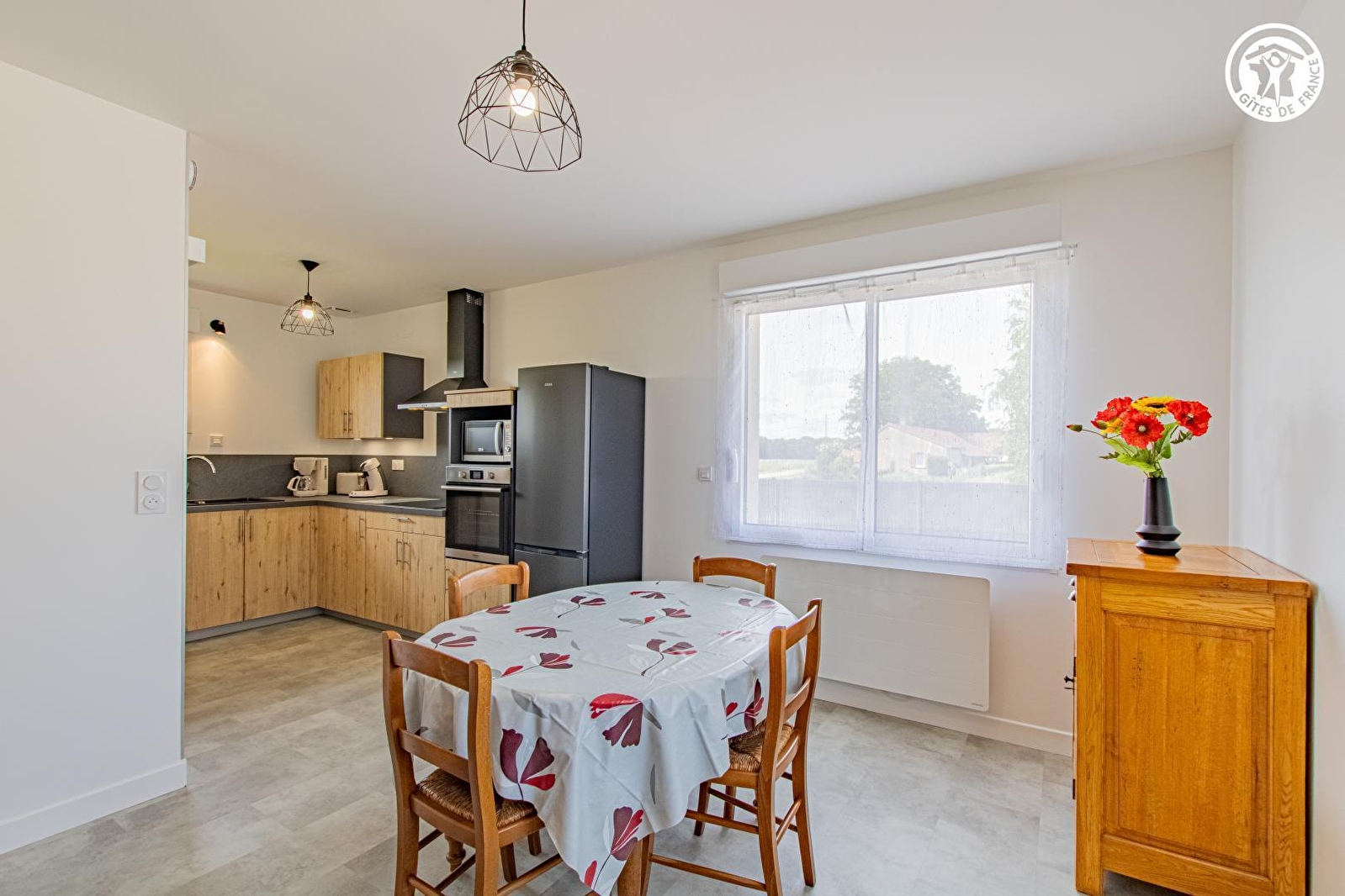 Composition : Maison individuelle (à l'écart sur une petite exploitation agricole familiale / propriété comprenant divers bâtiments). Wifi (fibre). Chauffage électrique. Rdc : cuisine-séjour-salon, chambre (lit 2 p. 140x190cm), salle d'eau (douche/Wc). 1er étage : 1 chambre (2 lits 1 p. 90x190cm). Terrasse + cour + jardinet + local vélos + parking privés. Petits commerces et petit supermarché 8 km.