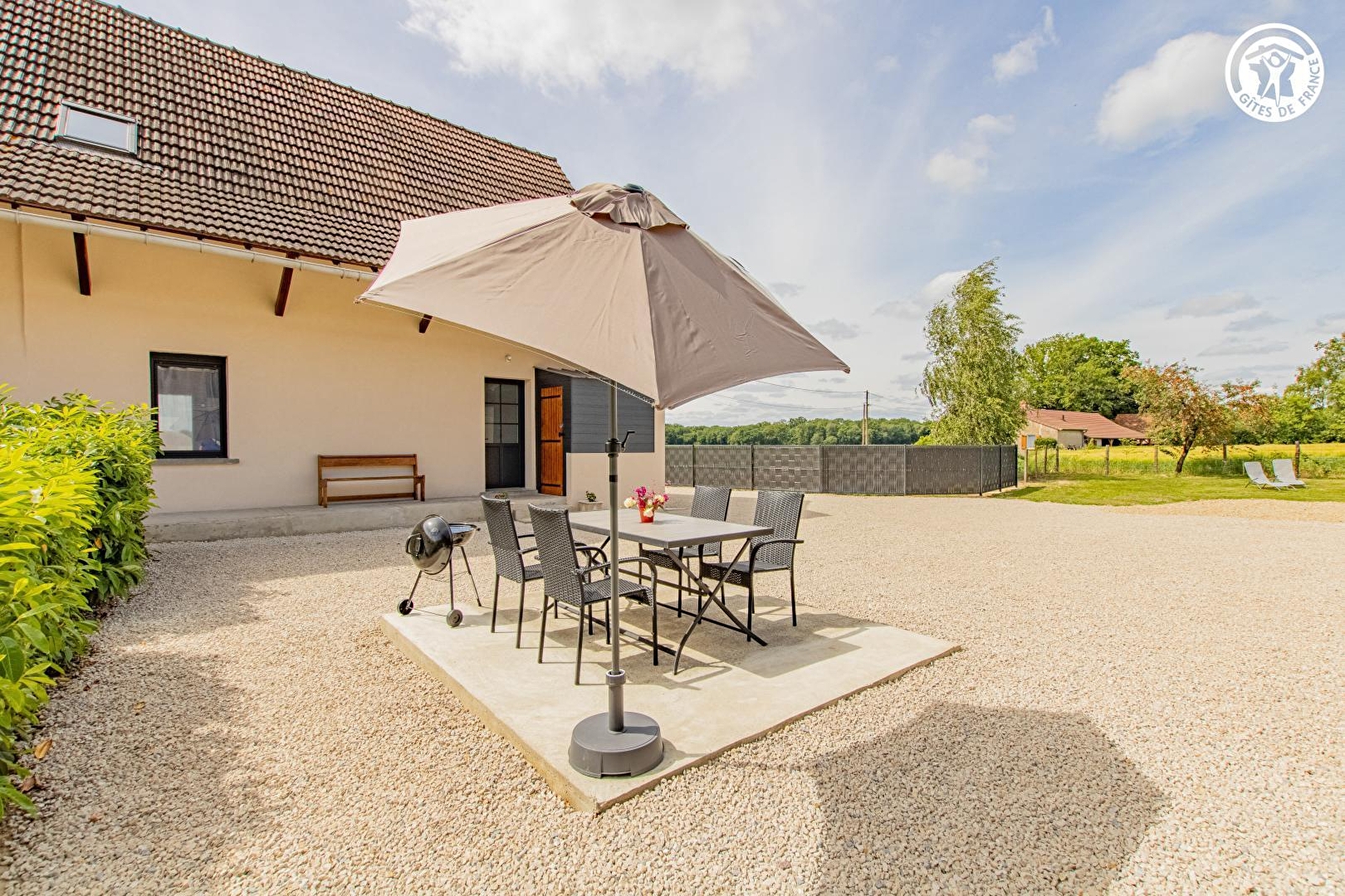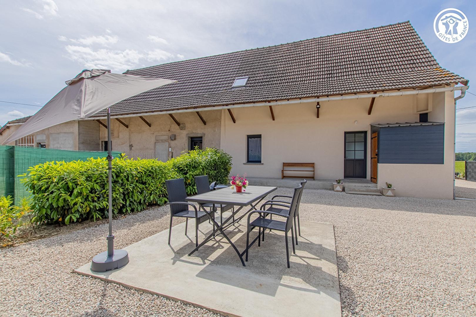 Élodie & Jérôme (agriculteur exploitant de la petite ferme familiale voisinant le gîte, à l'écart / élevage bovin & céréales en "agriculture raisonnée") vous ouvrent les portes d'une authentique demeure "fifties" typique d'après-guerre, intégralement restaurée & revisitée en douce villégiature, nichée au calme en lisière des prés, en pleine campagne bressanne, au sein d'un paisible hameau rural "dispersé", tout à la fois agricole & résidentiel. Apaisant écrin champêtre & naturel préservé alentour, lové au creux d'une verdoyante vaste clairière de champs de cultures & prairies parsemée de nombreux bucoliques étangs & rivières, cerclée de profondes forêts sauvegardées (accessibles à deux pas), non loin des rives du Doubs (véritable paradis des kayakistes & site de pêche ultra réputé pour ses célèbres silures, sandres ou carpes) remarquable écosystème pour partie protégé en "Zone Natura 2000" pour son exceptionnelle réserve ornithologique riche de 160 espèces et ses variétés végétales très rares. Possibilité d'observer la faune sauvage sur place (chevreuils, cerfs, renards, lièvres, chouettes, oiseaux et rapaces…). Spacieux gîte de bon confort. Chaleureux cachet campagnard aux accents contemporains sublimé par un rare & très élégant sol en carreaux de ciment d'époque côté salon. Ambiance zen & douce. Grande cour en gravier abritant une large terrasse exposée ainsi qu'un agréable jardinet engazonné blotti en lisière des champs & d'une petite mare privée sécurisée côté jardin (carpes, tanches... / pêche possible en "no kill"). Belle vue dégagée sur la campagne environnante.