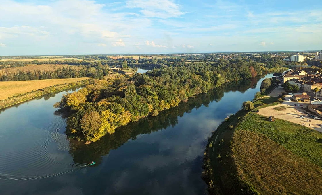 La confluence de la Saône et du Doubs se déploie sous nos yeux, tandis que le soleil commence à teinter les paysages d'une lumière dorée.