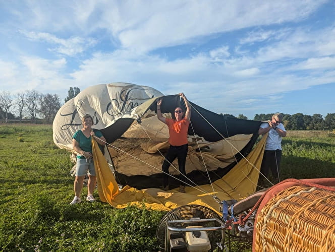 Il est déjà temps de dérouler l’immense toile qui, une fois remplie d’air, forme le majestueux ballon de la montgolfière. Nous tenons chacun un côté de la toile afin de fluidifier l’entrée d’air envoyé par le puissant ventilateur et faciliter le gonflage. Il faut compter entre 15 et 20 minutes de préparation, c’est déjà un spectacle fascinant pour les yeux.