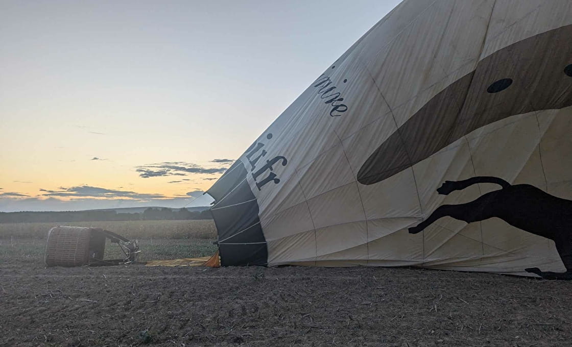 Nous donnons un coup de main pour replier le ballon et le mettre dans son sac, mais comment est-il possible qu’il rentre là-dedans ? A vous de le découvrir si vous vous laissez tenter par cette expérience ! Il n’y a plus qu’à ranger la nacelle. Après une bonne demi-heure de rangement, nous trouvons un coin tranquille pour partager un moment convivial autour d’un verre de crémant de Bourgogne. Comment mieux terminer cette soirée ?