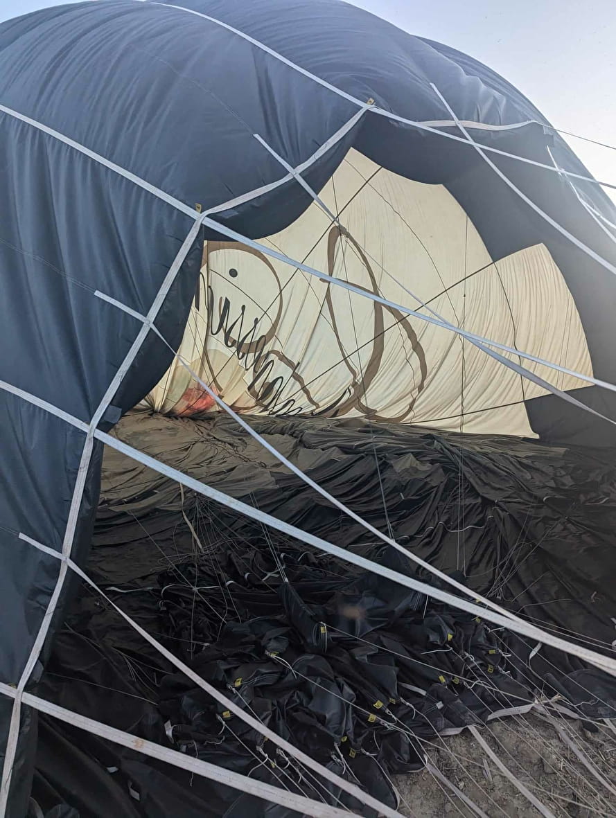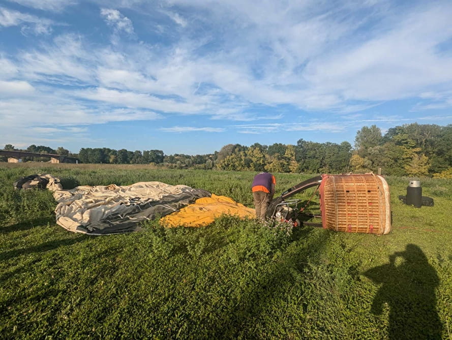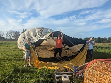 Après une heure de vol, on s’approche doucement d’une parcelle agricole, au gré du vent, pour l'atterrissage. Nous perdons de l’altitude rapidement et nous approchons donc du sol, avec une petite appréhension, accompagnée d’excitation. Rassurez-vous, en s'accrochant bien et en s'accroupissant, l'atterrissage provoque quelques secousses, mais surtout de grands éclats de rire !